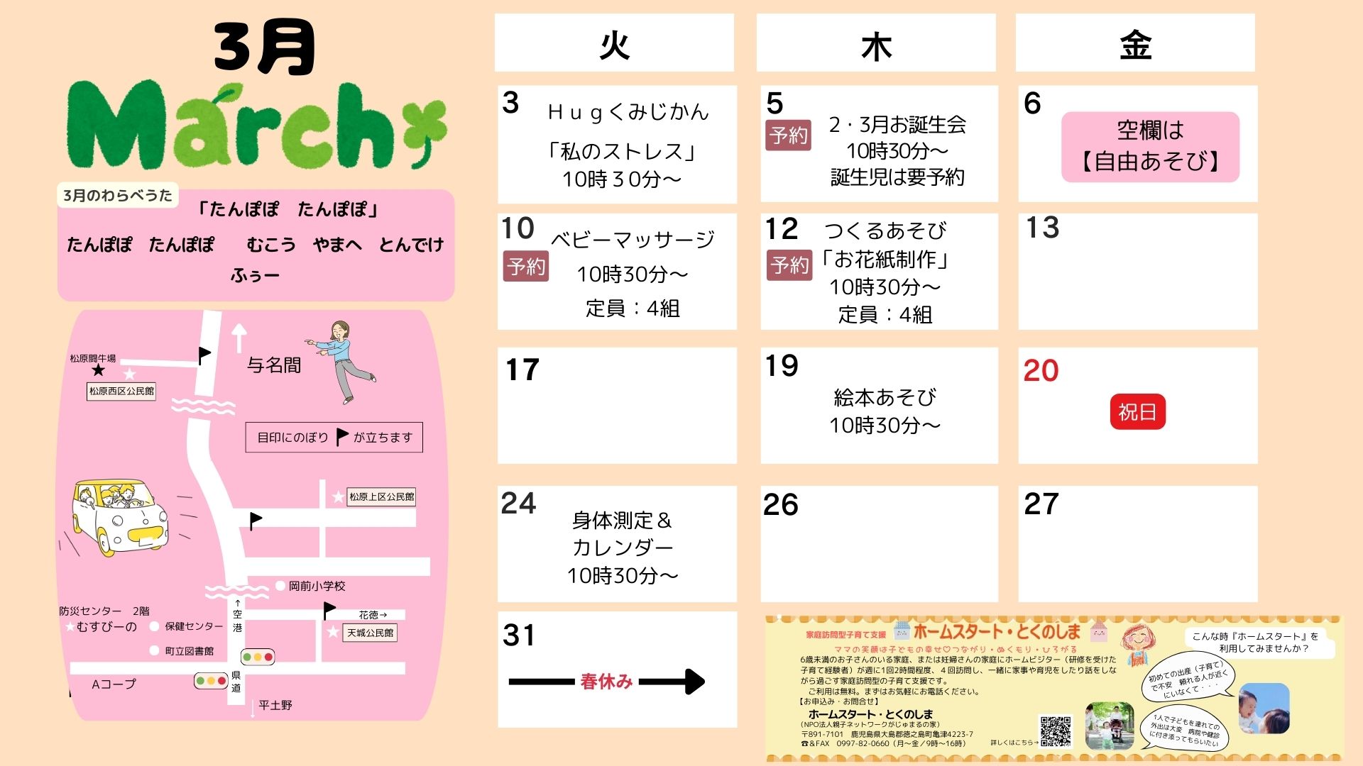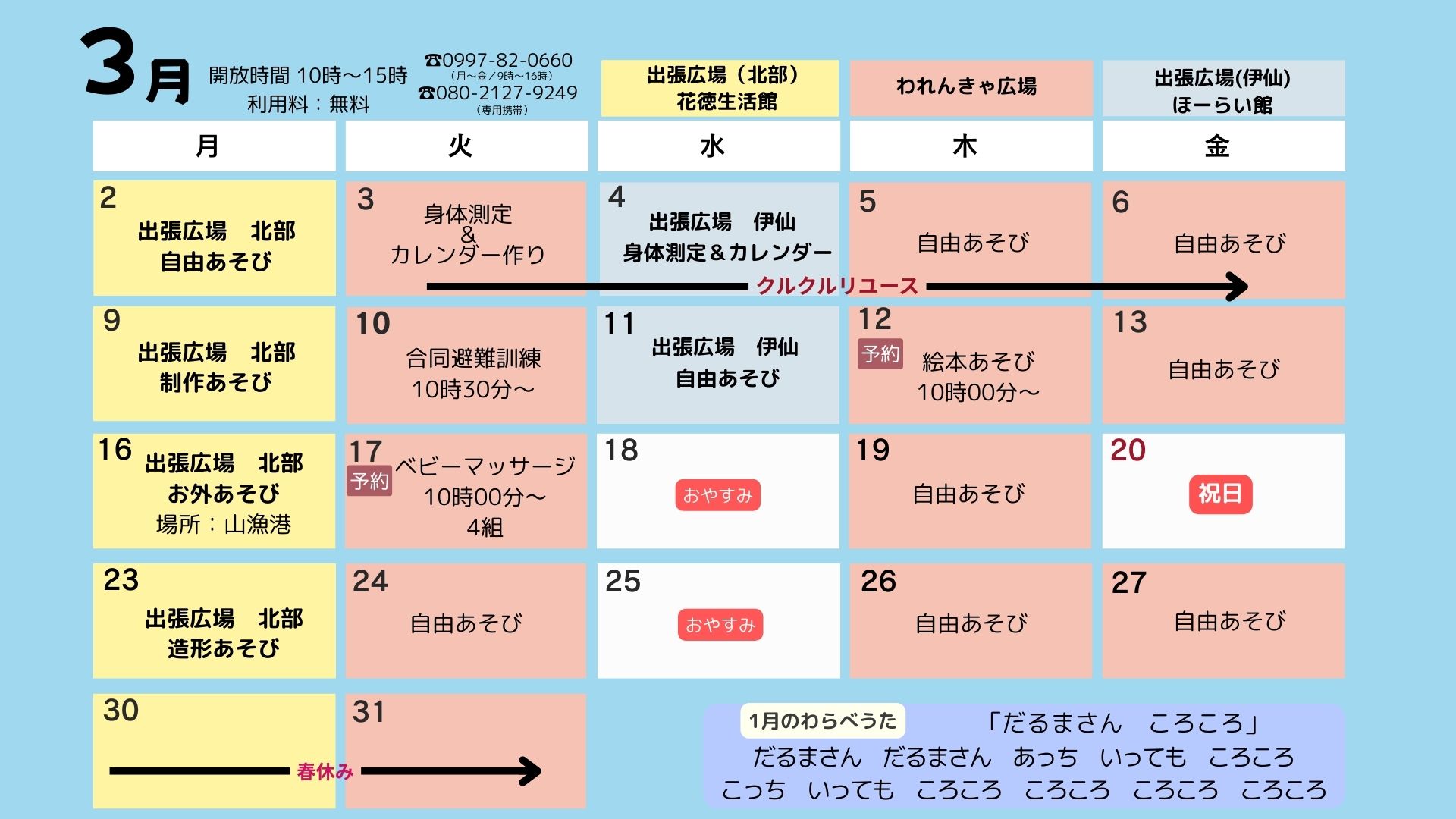 2026年3月 2026 3/01 むすびーの伊仙町北部出張広場われんきゃ広場 イベントご予約は、12月1日(月)~ 受付いたします ご予約はこちら むすびーの 専用電話番号 070-4333-5605(月~金曜日/09:00~16:00) イベントのご予約は 12月1日(月)~ 受付いたします。 ご予約はこちら われんきゃ広場 専用電話番号 080-2127-9249(月~金曜日/09:00~16:00) 2026年2月