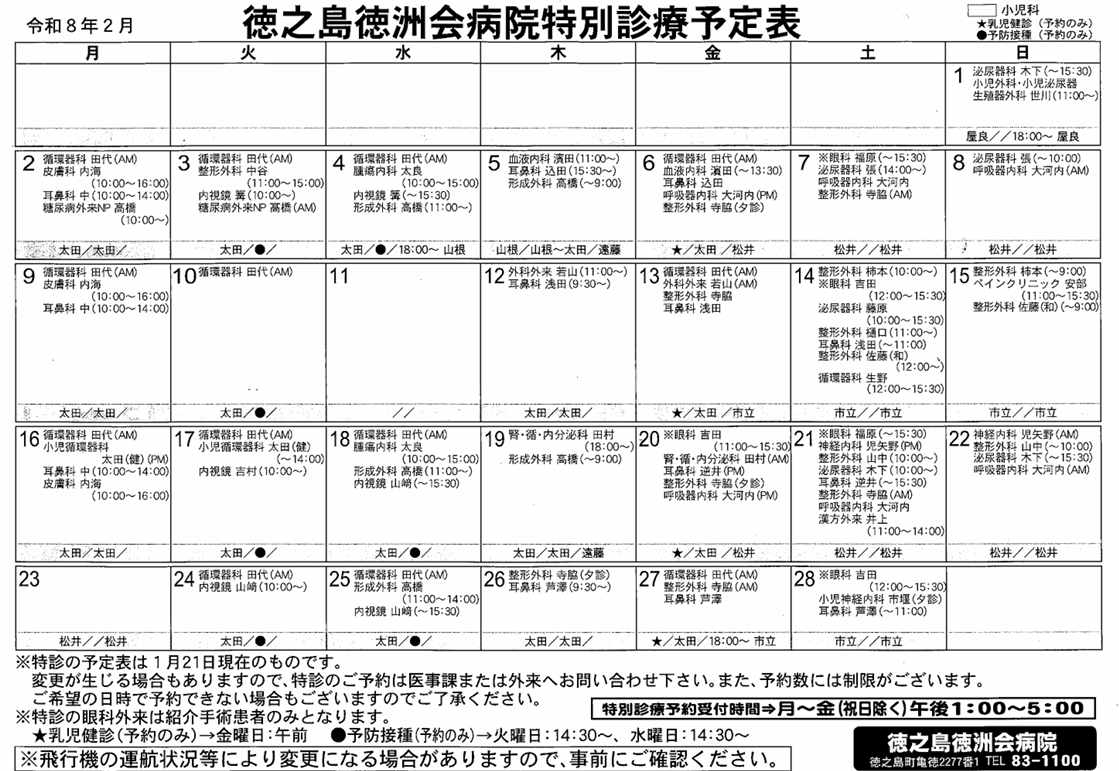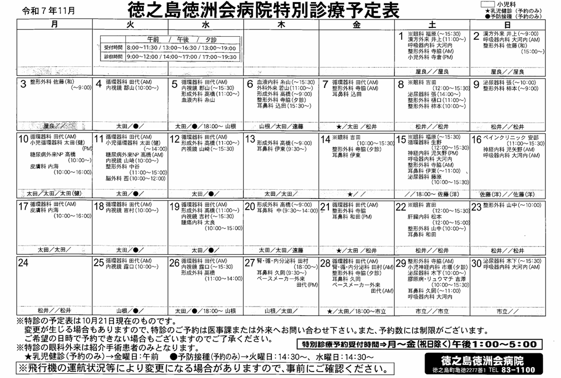 天候不良等による飛行機の欠航、その他の都合により、担当医師、及び日程・時間等が直前に変更または中止となる場合があります。