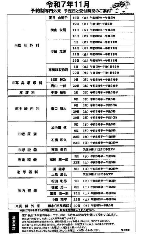 整形外科・循環器・呼吸器・泌尿器科・皮膚科・内分泌・小児神経内科・小児循環器科・産婦人科外来・消化器科(内視鏡)