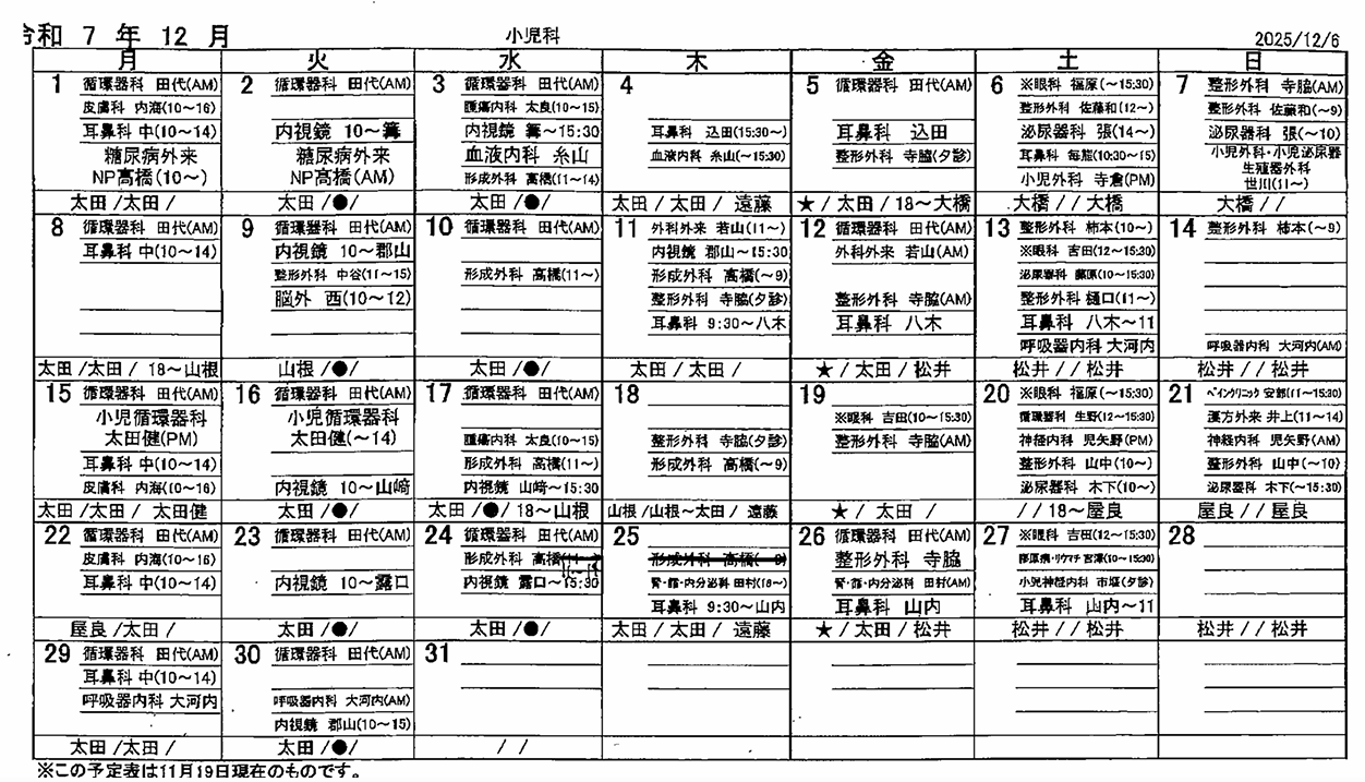 | 乳児検診 | 毎週水(午前) |