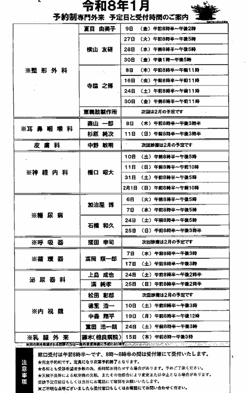 整形外科・循環器・呼吸器・泌尿器科・皮膚科・内分泌・小児神経内科・小児循環器科・産婦人科外来・消化器科(内視鏡)