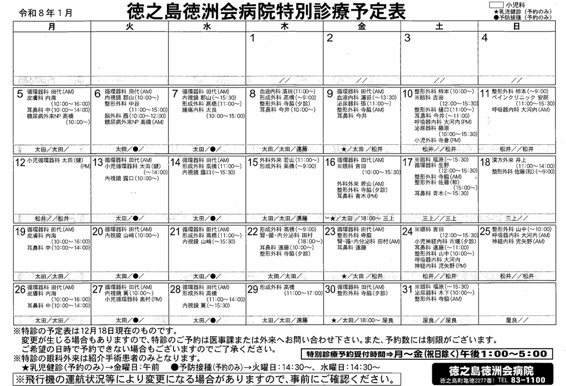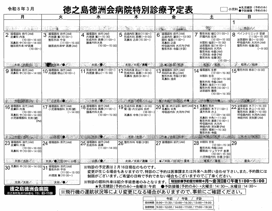 天候不良等による飛行機の欠航、その他の都合により、担当医師、及び日程・時間等が直前に変更または中止となる場合があります。