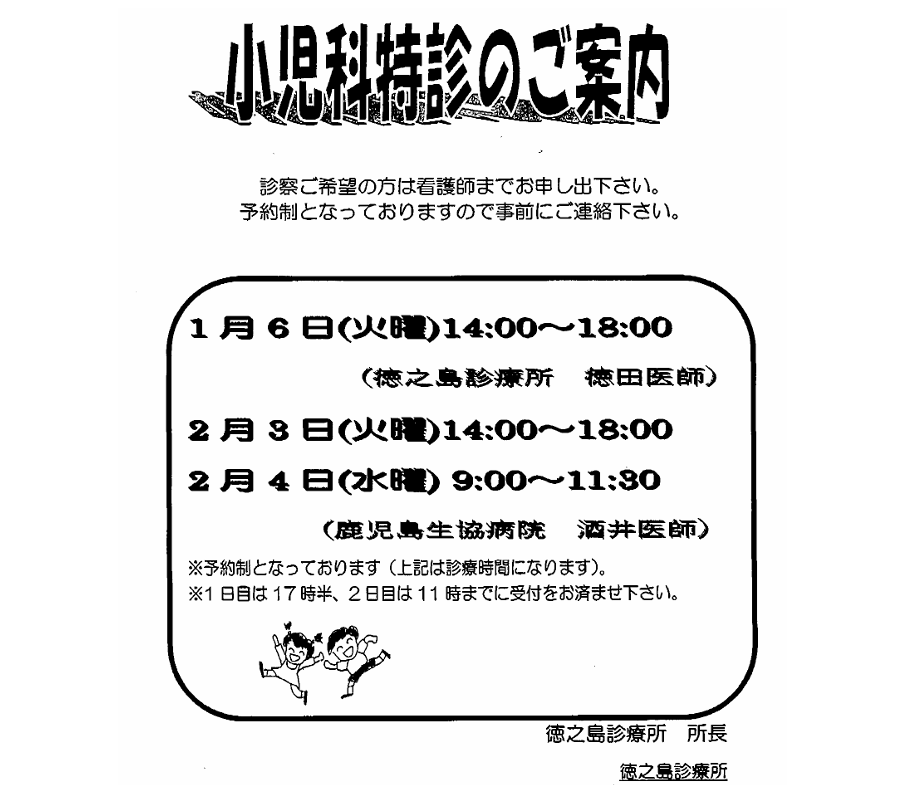 | 小児予防接種 | 予約受付…月~金 14:00~16:30 実施…月・火・木・金 午後診 |